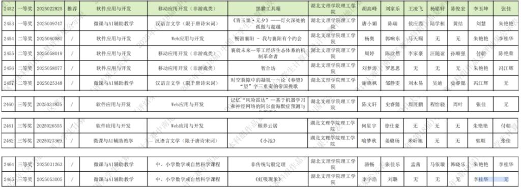 经过激烈角逐,电信学院参赛队伍在软件应用与开发类别中获得省级一等奖1项,省级二等奖3项,省级三等奖2项。在微课与AI辅助教学类别获得省级一等奖1项,省级二等奖1项,省级三等奖3项。具体获奖情况如下:
