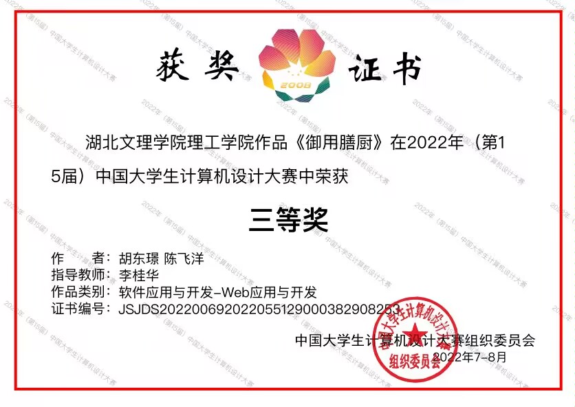 (电信系 李桂华)日前,2022年(第15届)中国大学生计算机设计大赛中国赛评选结果揭晓,本次比赛中我们电信系计算机专业胡东璟、陈飞洋同学的作品《御用膳厨》在近850所院校的6611件国赛作品中脱颖而出,获得“国家三等奖”的好成绩。