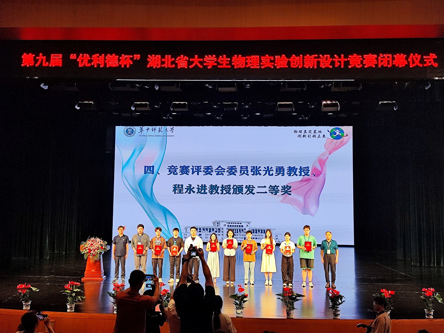 (电信学院 宁珍珍)近日,2024年第九届“优利德杯”湖北省大学生物理实验创新设计竞赛决赛在华中师范大学圆满落幕。我们参赛的五支队伍分别获得团体二等奖2项、三等奖1项、优秀奖2项的成绩,其中作品《基于斯特林热机探究热力学第二定律的研究装置 》、《光纤振动传感器的研究与制作》荣获二等奖,作品《空间弱磁场测量》荣获三等奖。
