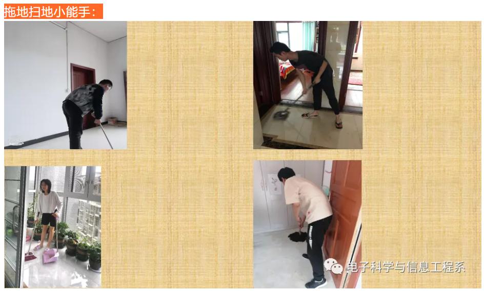 2020年4月20日至5月20日,电信系开展爱国卫生运动,利用课余时间主动承担各种家务活,帮助家人干农活,培养学生劳动意识、劳动习惯、劳动能力。