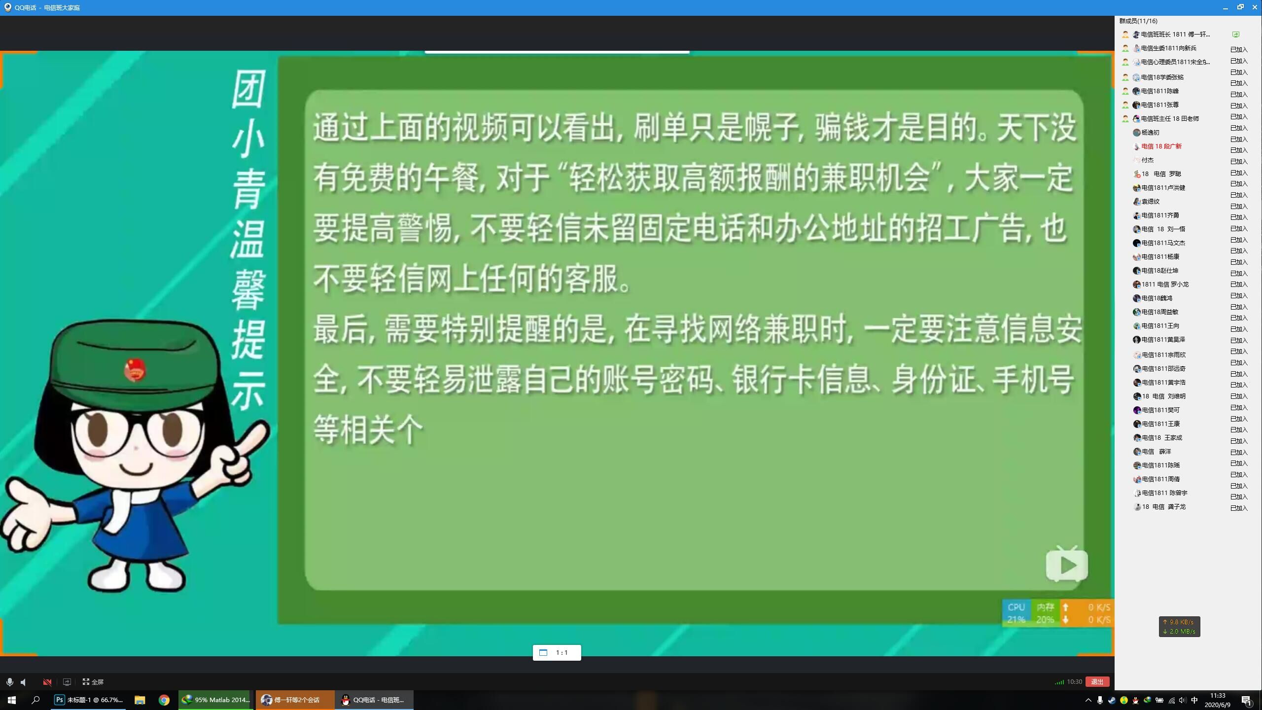 2020年6月1日至6月12日,电信系开展“防范电信网络诈骗线上主题团日活动”,利用主题班会观看防诈骗视频宣传片,阅读《防范电信网络诈骗告知书》,分享预防网络诈骗的知识,提高学生防电诈意识,维护学生的安全与权益。