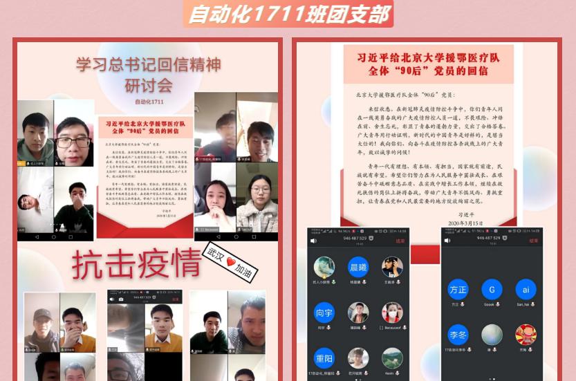 2020年3月,电信系通过支部研讨会、分享抗击疫情中最令我感动的瞬间和“祖国,我想对你说”等环节开展“学总书记回信,话青春担当”线上主题团日活动。