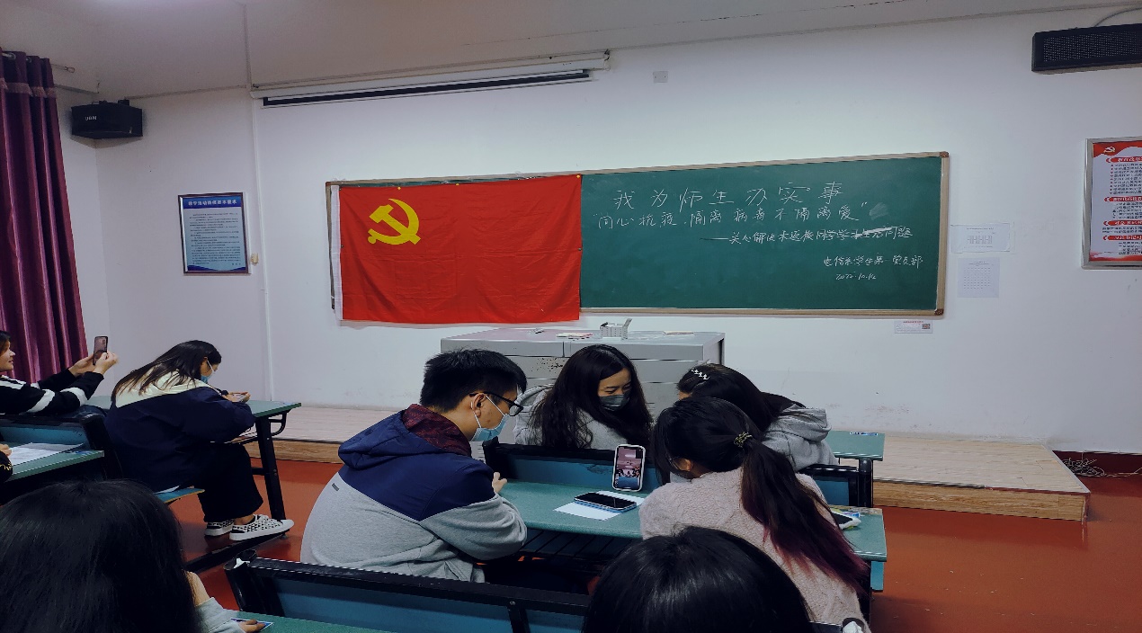 (电信系彭亚岚 夏浩瀚)为进一步落实“我为师生办实事”实践活动,切实解决学生学习生活中存在的问题。电信系学生一支部于10月14日至10月17日在4J-235开展“同心抗疫、隔离病毒不隔离爱”主题教育,关心因疫情暂缓返校同学的学习生活问题。