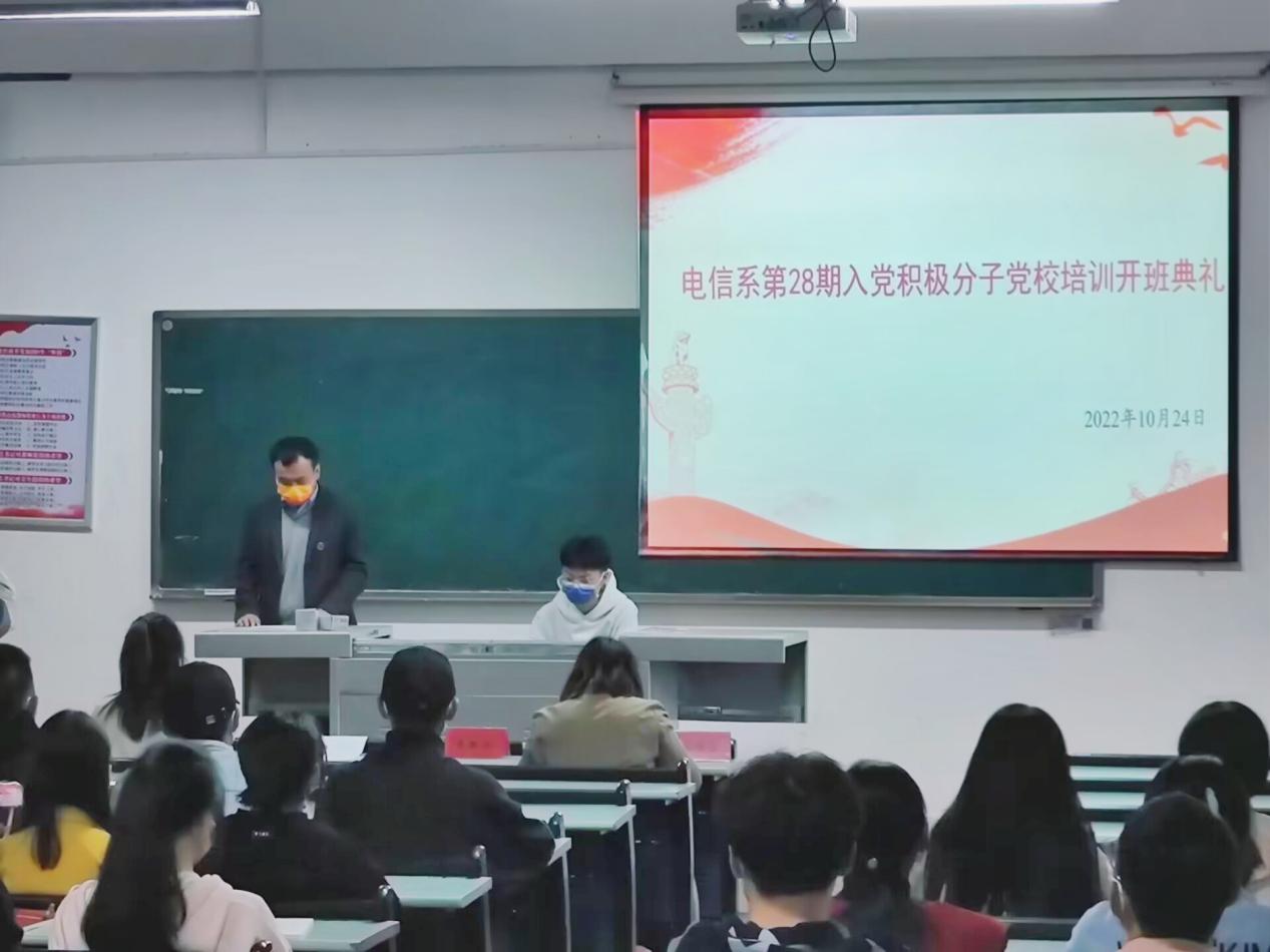 会上,学生第二支部书记刘圆鑫同志宣读中共伟德bv1946官网委员会党校《第28期入党积极分子培训班》文件,介绍了入党积极分子教育培训内容。学员代表胡段行同学和优秀学生党员代表陈筱同志分别发言。会议最后电信系主任王献合同志发表讲话,对全体学员提出几点希望:一是珍惜学习机会,锤炼党性修养。二是学思用贯通,提高学习成效。三是增强身份认同,勇担时代使命。