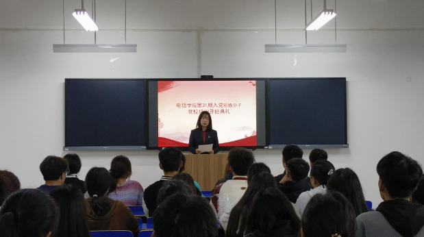 (电信学院 刘圆鑫)4月16日中午,电信学院党校第31期入党积极分子培训班开班典礼在1教207教室举行。电信学院分团委书记王琳琳同志、电信学院学生第一党支部书记彭亚岚同志及80位党校培训班学员参加了本次典礼。典礼由党校班主任刘圆鑫老师主持。