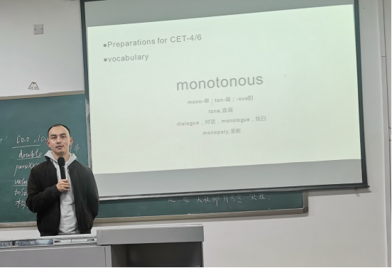 首先,胡老师阐述了英语学习以及通过四级的重要性,勉励同学们克服困难,认真学习英语,不断提升自己。然后,他开始讲解如何通过词根词缀法和联想法快速记忆单词,强调单词记忆的方法“勤标记,多重复”。紧接着,他介绍了英语阅读精读方法,告诉他们如何打牢基础,吃透文本。最后,他对英语四级写作与听力的出题思路进行剖析,传授同学们训练方法。