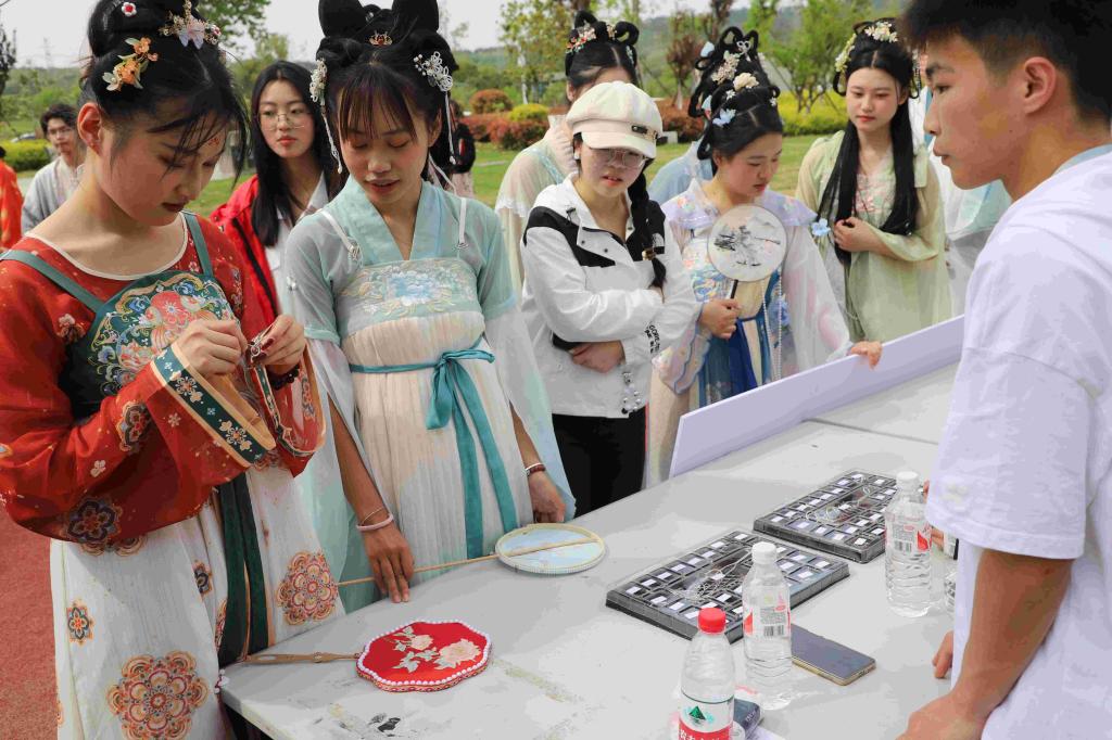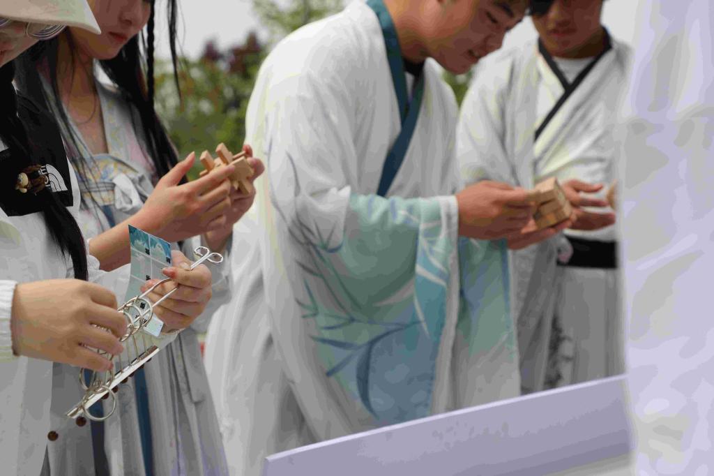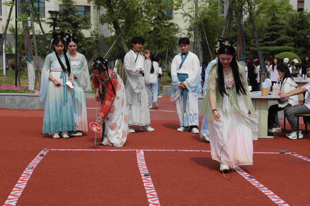 本环节设置了投壶游戏。投壶是射礼的演变和延续,是古代士大夫饮酒时博弈助兴的一种游艺项目,起源于春秋,盛于魏晋。比赛当中,参与者们聚精会神,瞄准剑壶,认真投出每一支羽箭,有的甚至还摸索出投射角度与弧度的成功率。投壶比赛吸引了一堆围观群众,“啦啦队们”紧盯着箭羽的飞行轨迹,并为投中的同学欢呼雀跃,整个现场掌声、笑声、喝彩声不断,热闹非凡。