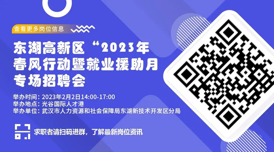 为全面贯彻党的二十大精神,坚决落实省、市关于就业工作的决策部署和省、市关于稳就业、保就业工作要求,根据工作安排,武汉市人社局东湖分局定于2月举办东湖高新区“2023年春风行动暨就业援助月专场招聘会”。