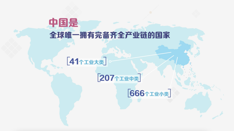 2021年中国经济总量达114.4万亿元,稳居世界第二,占全球经济比重超18%。历经70余年发展,中国经济已经积累了雄厚的物质基础,发展成为全球唯一一个拥有全产业链的国家。片中以口罩的生产,生动演示中国齐全的工业门类,独立完整地成为内循环的基础。