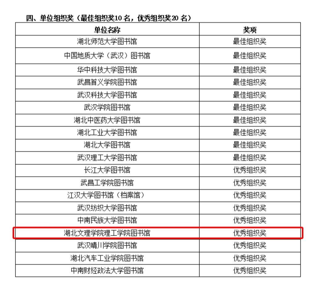 (图书馆 王林珊)近日,第七届湖北省高校图书馆“馆员风采”大赛圆满落幕。在大赛线上答题环节中,我们图书馆馆员表现优异,共斩获二等奖、三等奖各一项。同时,我们图书馆也凭借出色的组织工作,获评大赛“优秀组织奖”。