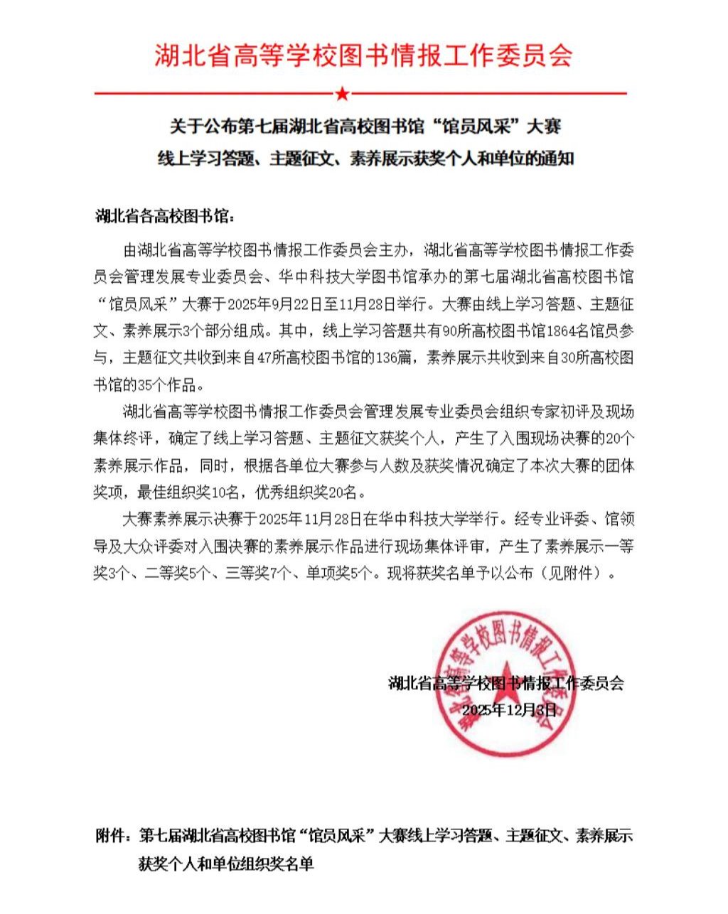 第七届湖北省高校图书馆“馆员风采”大赛由湖北省高等学校图书情报工作委员会主办,湖北省高等学校图书情报工作委员会管理发展专业委员会、华中科技大学图书馆承办,于2025年9月22日至11月18日举行,其中,线上学习答题共有90所高校图书馆1864名馆员参与,主题征文共收到来自47所高校图书馆的136篇,素养展示共收到来自30所高校图书馆的35个作品。