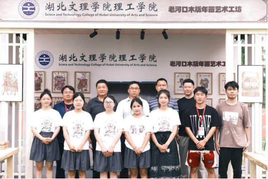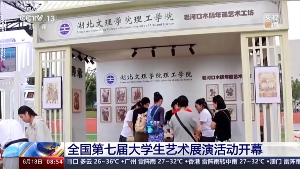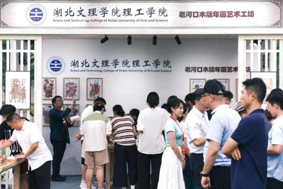 (艺传学院 郭裕文)6月12日,全国第七届大学生艺术展演活动在湖北襄阳正式开幕。开幕式前,在室外体育场举办的“你好!大艺村”高校艺术创意作品展览会上,由我们艺术与传媒学院院长曹树进、党总支书记陈美霖、刘璐老师指导,环境设计和视觉传达专业学生参与研发制作的老河口木版年画及相关文创产品展演项目作为我们特色美育成果正式亮相,吸引了不少现场观众前来体验。