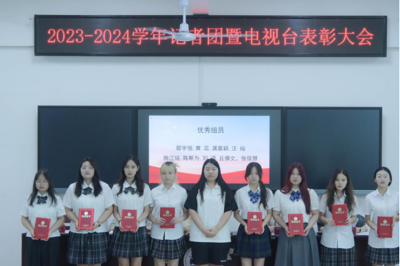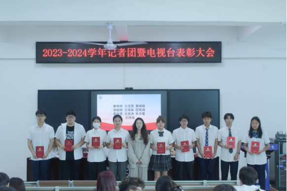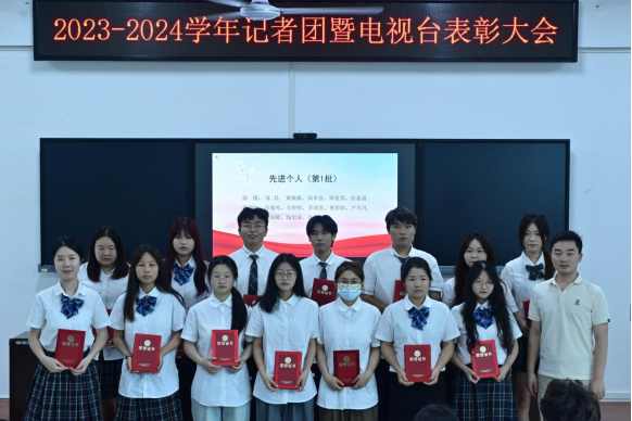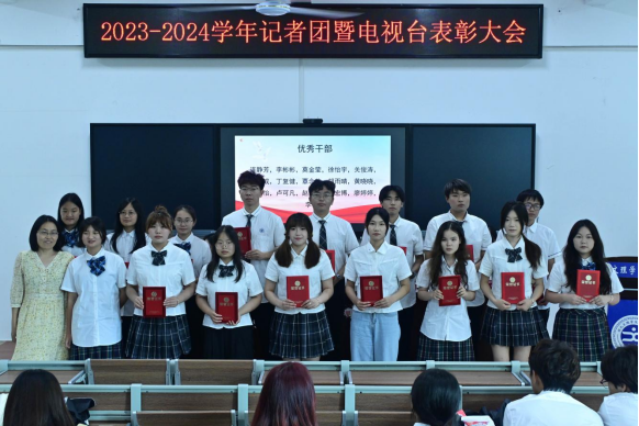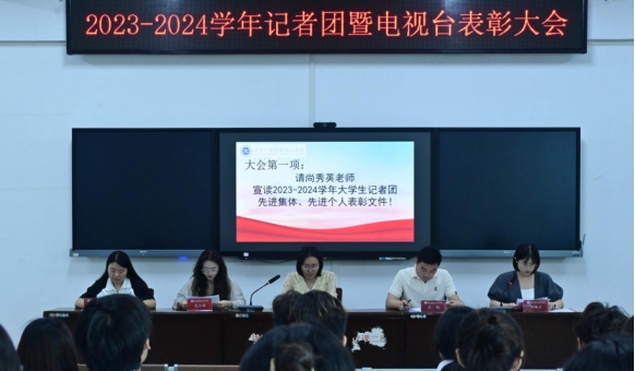 (大学生记者团 李佳奇 王琪森)6月11日下午,我们2023-2024 学年大学生记者团暨学校电视台表彰大会在1教105报告厅召开。党群工作部部长尚秀英、副部长王凯,艺术与传媒学院分团委书记吴文婷,大学生记者团指导老师邓琳子,电视台指导老师曹芷若以及大学生记者团、学校电视台全体成员参加此次大会。大会由大学生记者团指导老师邓琳子主持。