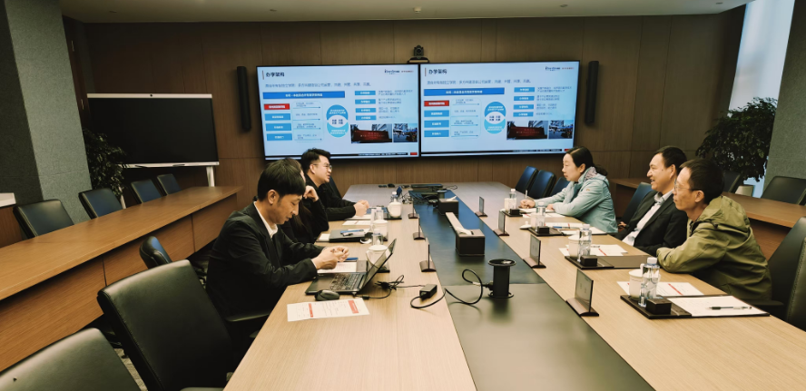 在软通动力北京总部,赵乔一行参观了软通动力集团展厅,并详细听取了软通动力集团和软通动力教育科技有限公司的发展和建设情况介绍。随后,双方一同步入会议室,围绕产教融合、专业建设、创新人才培养模式、学生实习就业等方面进行了深入交流。