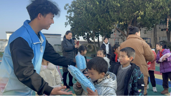 12月13日,大学生志愿者将围巾送到了樊城区牛首镇袁营小学,为孩子们在寒冷的冬日带来了温暖与祝福。该校共有来自幼儿园至二年级78名同学,孩子们收到围巾都非常开心。志愿者们将温暖的围巾一一围在孩子们的脖子上,每一条围巾都饱含着青年大学生对孩子们的关心与关爱。孩子们的脸上洋溢着纯真的笑容,明亮的眼睛里闪烁着惊喜与感动。