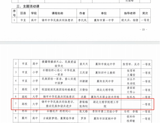 近日,襄阳市铸牢中华民族共同体意识精品课评选结果对外公布。由我们马克思主义学院张炜钊和唐银梅两位教师讲授的《铸牢中华民族共同体意识,推动民族和谐共进步》获得襄阳市铸牢中华民族共同体意识精品课“主题活动课”组一等奖。
