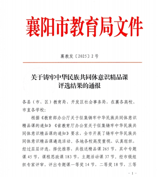 (党群工作部 王凯)为深入学习贯彻党的二十届三中全会和全国教育大会精神,落实国家教育数字化战略行动有关要求,深化铸牢中华民族共同体意识教育课程教学改革,增强教师教书育人能力,推进教育系统铸牢中华民族共同体意识工作走深走实,襄阳市开展了铸牢中华民族共同体意识精品课征集活动。