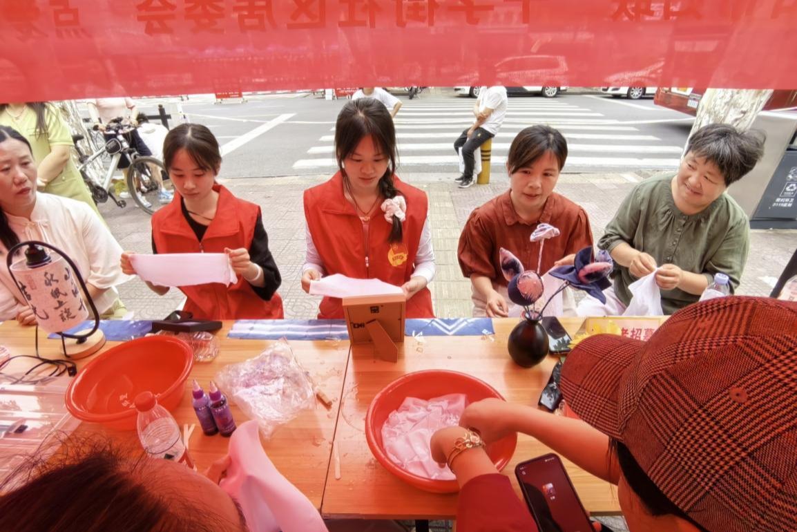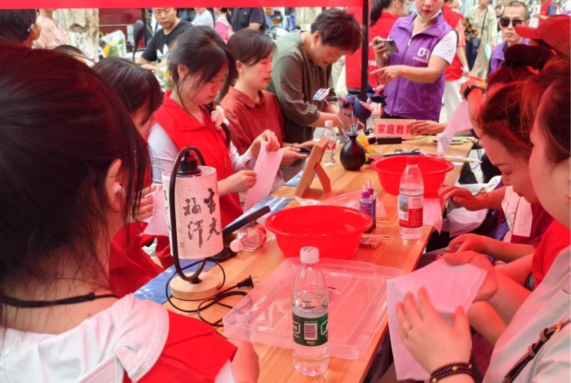 在为考生提供服务的同时,志愿者们也时刻关注着考场外家长们的需求。烈日下,志愿者们穿梭在等待的人群中,为家长们递上一瓶瓶清凉的矿泉水,并引导他们到阴凉的休息区休息。考虑到家长们长时间等待可能会产生焦虑情绪,协会精心策划了扎染制作体验活动。志愿者们化身“手工老师”,向家长们详细讲解扎染的历史文化、制作技巧和步骤。从布料的折叠、捆扎,到染料的调配、浸染,每一个环节都耐心指导。家长们围坐在一起,专注地制作着扎染作品,现场气氛轻松愉悦。