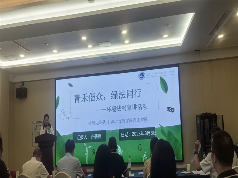 (经管学院 刘紫霞 许蓓蓓)8月8日上午,在襄阳市生态环境局主办的“绿色风”生态志愿服务项目终选路演中,我们经济与管理学院“律氧先锋队”凭借“青禾偕众,绿法同行”环境法制宣讲项目荣获优秀奖,并获得2000元项目扶持资金。