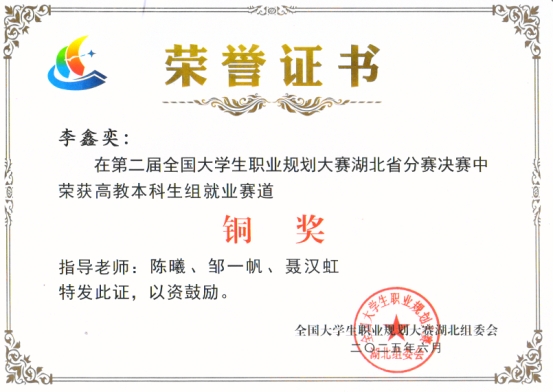(通讯员 左林 陈曦)近日,从湖北省教育厅获悉,我们教育学院2022级汉语言文学专业的李鑫奕同学获得第二届全国大学生职业规划大赛湖北赛区决赛就业赛道高教本科生组铜奖。