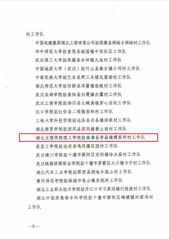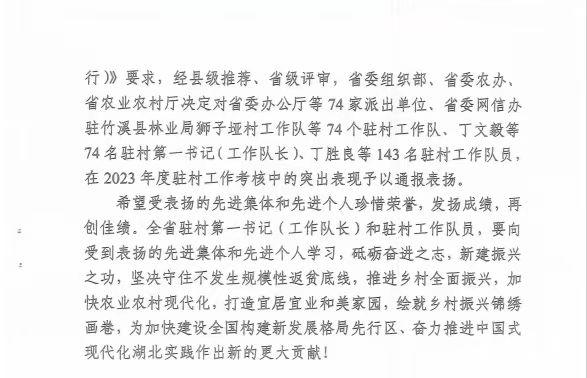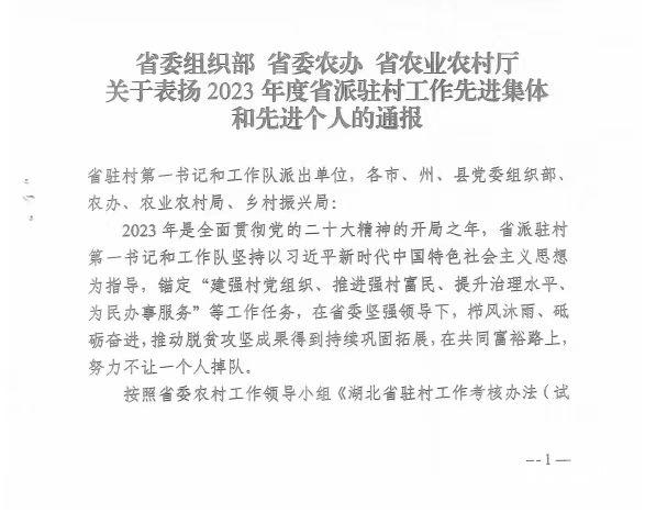 根据省委组织部、省委农办、省农业农村厅《关于表扬2023年度省派驻村工作先进集体和先进个人的通报》,伟德bv1946官网驻南漳县李庙镇傅家坪村工作队获评湖北省“2023年度工作突出驻村工作队”。