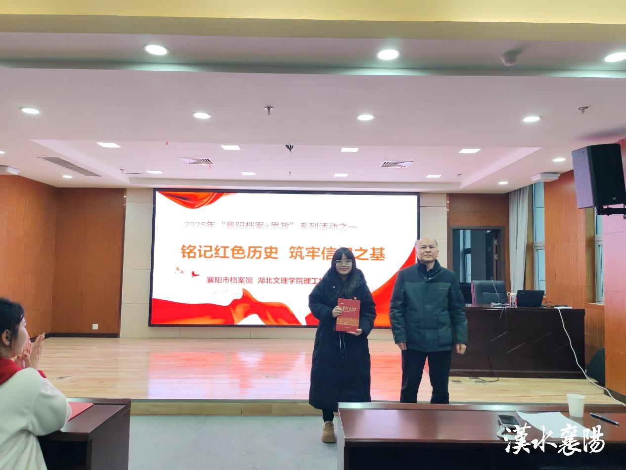活动尾声,襄阳市档案馆副馆长雷新运同志代表单位向理工学院学生赠送了2本《红色档案 襄樊战役》书籍。