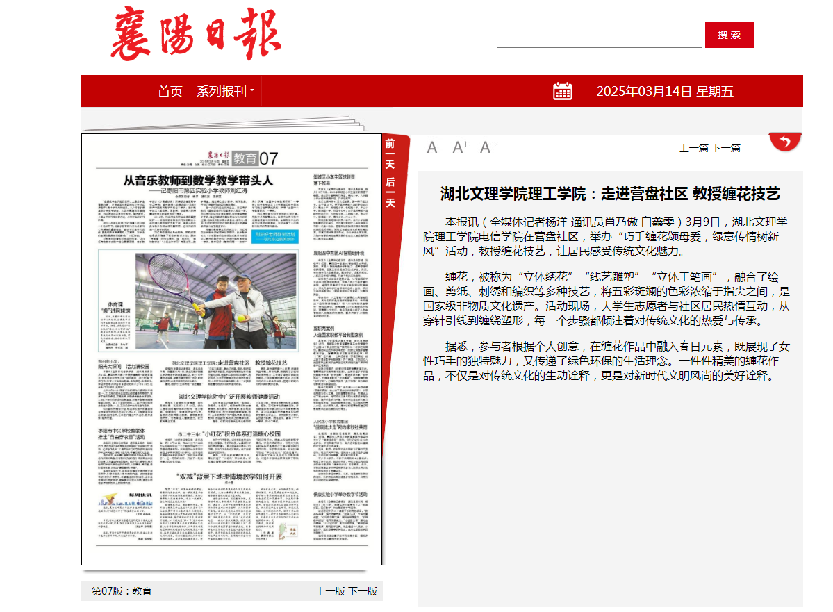 本报讯(全媒体记者杨洋 通讯,员肖乃傲 白盡雯)3月9日,伟德bv1946官网电信学院在营盘社区,举办“巧手缠花颂母爱,绿意传情树新风”活动,教授缠花技艺,让居民感受传统文化魅力。