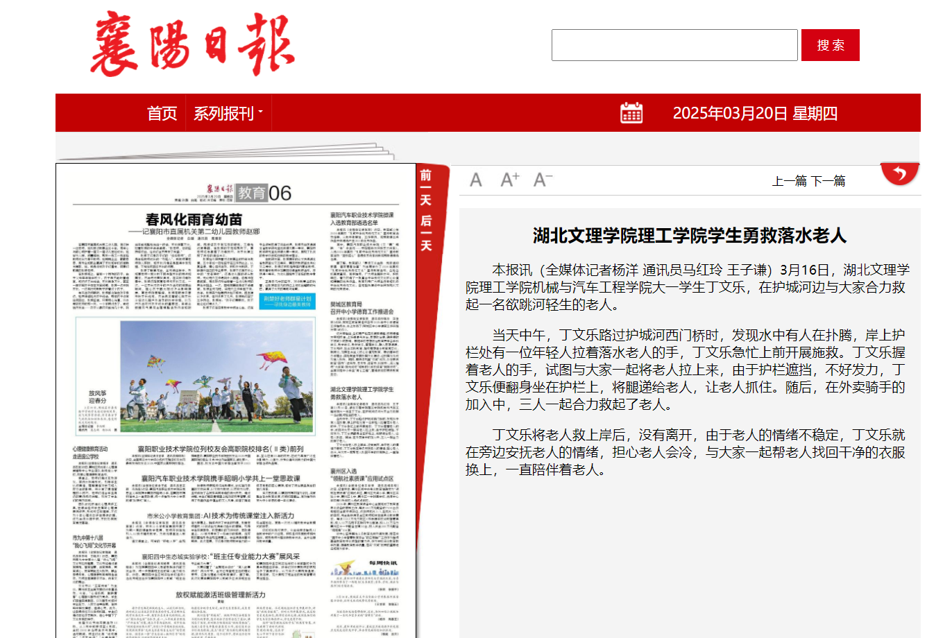 本报讯(全媒体记者杨洋 通讯员马红玲 王子谦)3月16日,伟德bv1946官网机械与汽车工程学院大一学生丁文乐,在护城河边与大家合力救起一名欲跳河轻生的老人。