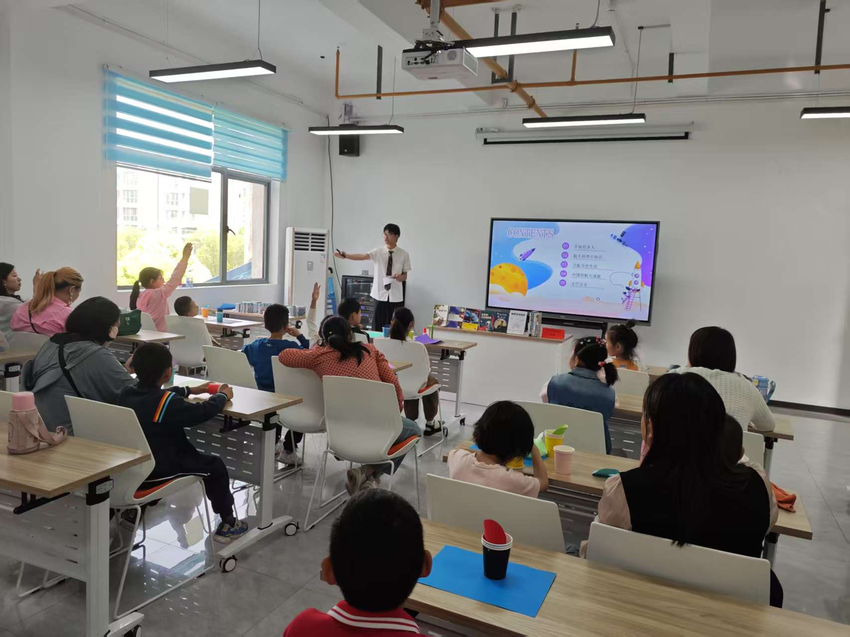 手工环节变身“航天智造实验室”。志愿者通过分发航天器立体拼图、超轻黏土等材料,以及实物拆解演示火箭分级结构、空间站模块功能,引导孩子们成为“航天工程师”。只见孩子们专注拼接“天宫空间站”模型,用彩泥捏制佩戴五星红旗臂章的宇航员,甚至用铝箔纸打造“反光版”宇宙飞船。当一组组充满童趣的“太空作品”诞生时,孩子们争相介绍自己的“设计理念”:“我的火箭要去火星种土豆!”“这个空间站能住100个宇航员!”奇思妙想中洋溢着对深空探索的无限热忱。