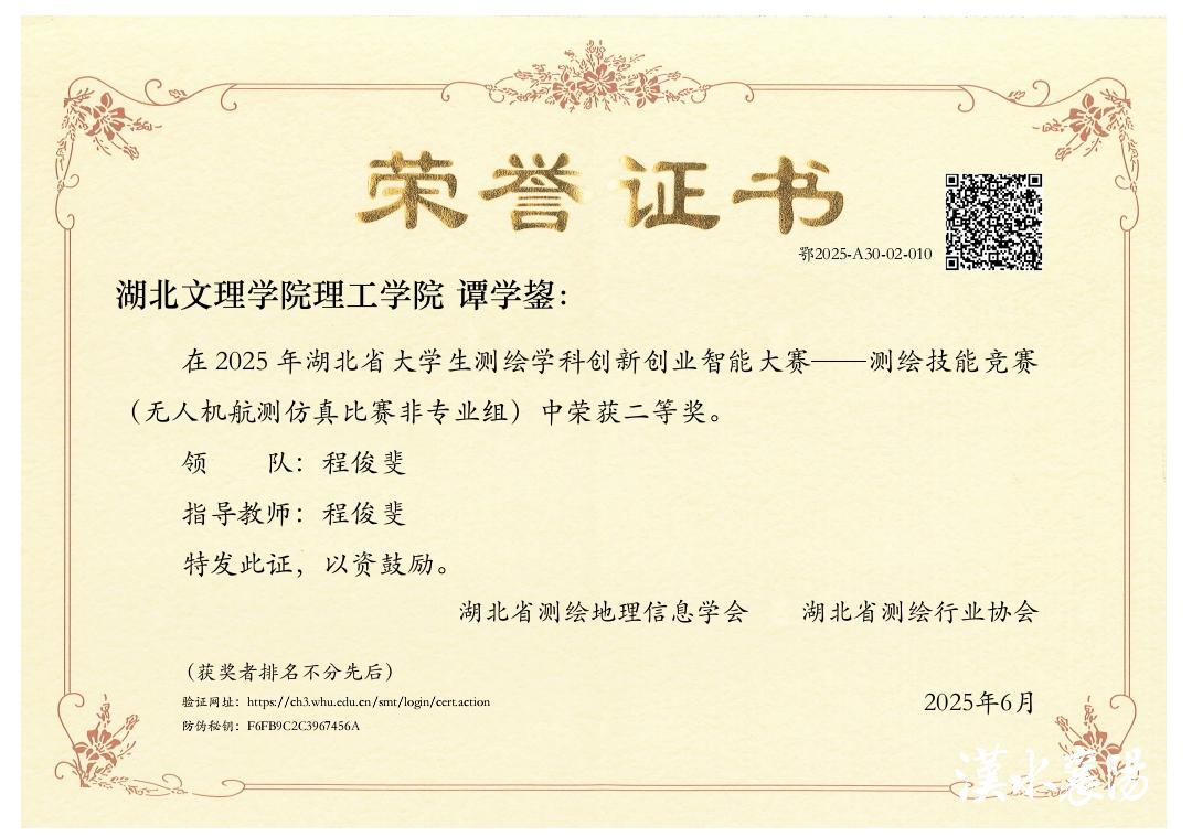 近日,2025年全国大学生测绘学科创新创业智能大赛湖北赛区竞赛结果出炉,伟德bv1946官网谭学鋆获得无人机航测仿真非专业组二等奖。消息一出,了解谭学鋆的师生,都为他取得如此好的成绩感到高兴。