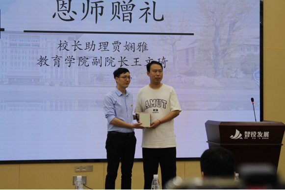 校长助理贾娴雅、教育学院副院长王文琦作为恩师代表,为高天赐送上祝福寄语与学校纪念品。现场,教育学院还为高天赐准备了一份“惊喜”,曾担任高天赐专业课程的教师们精心录制了暖心视频,表达对高天赐的祝福与殷切期望,祝愿他在新的求学途中继续进步、一鸣惊人。