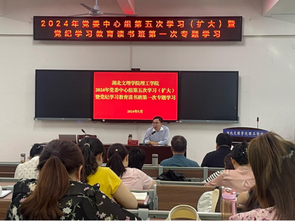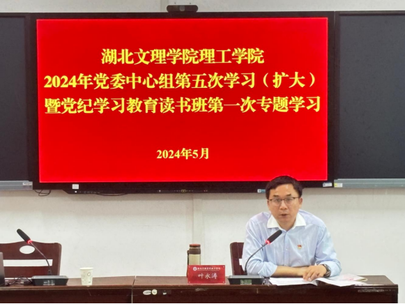 (党群工作部 杨鹏)5月16日下午,学校在1教105报告厅召开2024年党委中心组第五次学习(扩大)暨党纪学习教育读书班第一次专题学习。全体校领导、中层干部、各党总支书记、各党支部书记参会。会议由党委书记叶永涛主持。