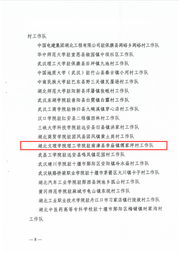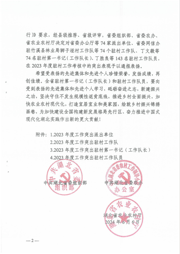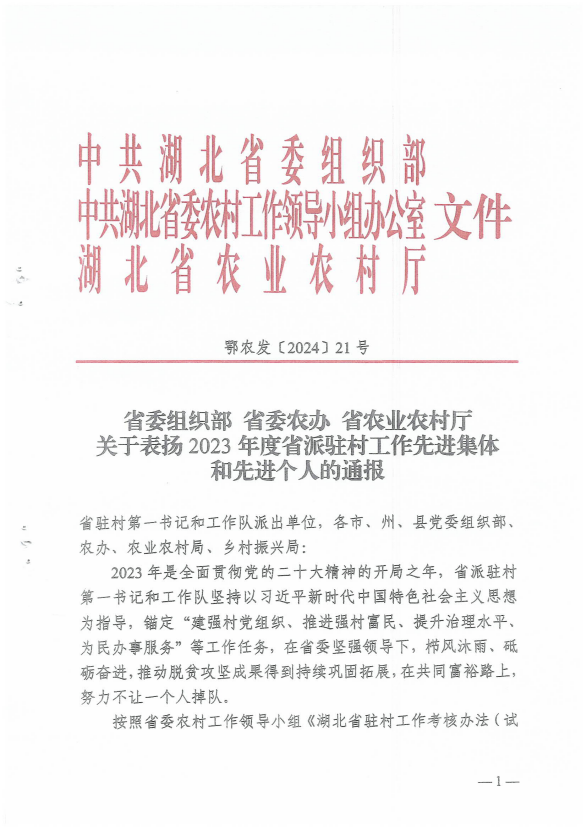 (乡村振兴办公室 秦晓磊)根据省委组织部 省委农办 省农业农村厅《关于表扬2023年度省派驻村工作先进集体和先进个人的通报》(鄂农发〔2024〕21号),我们驻南漳县李庙镇傅家坪村工作队获评湖北省“2023年度工作突出驻村工作队”。