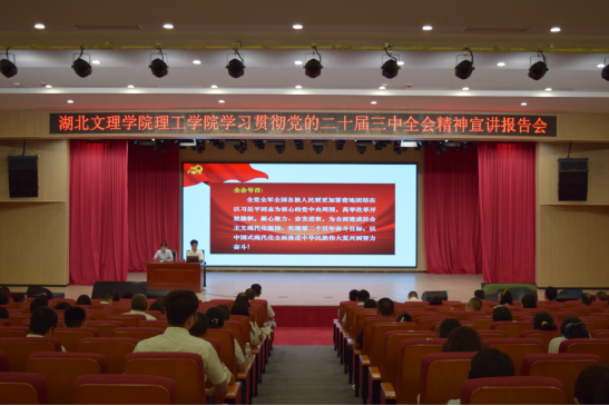 (党群工作部 杨鹏)9月12日下午,学校在大学生活动中心三楼报告厅举行学习贯彻党的二十届三中全会精神宣讲报告会。襄阳智投教育发展有限公司领导及全体员工,学校领导、中层干部、党支部书记、辅导员、马克思主义学院教师代表参会。会议由校长助理朱雪林主持。