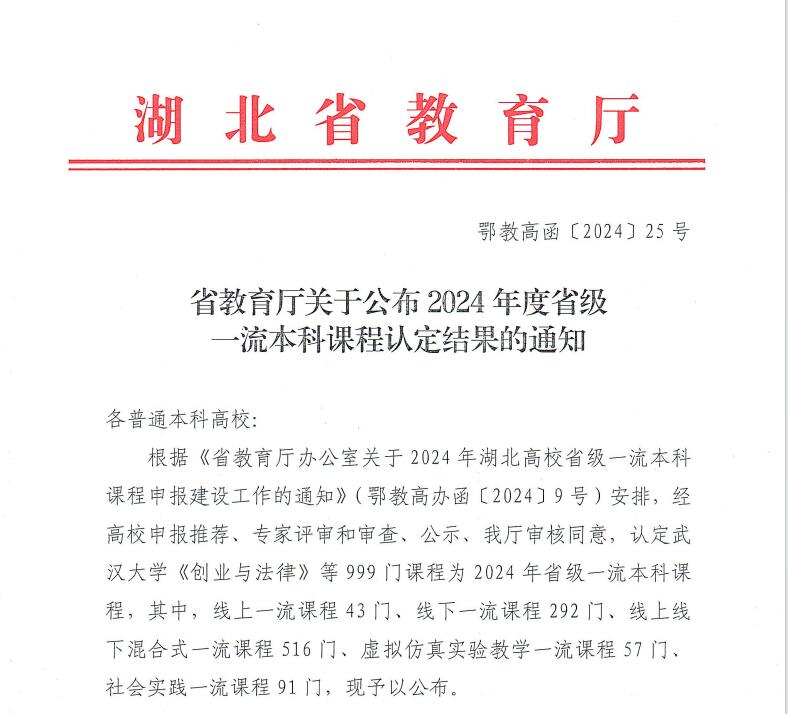 (教学科研部 安箓)11月20日,湖北省教育厅公布了2024年湖北高校省级一流本科课程名单,我们共有5门课程获批省级一流本科课程,其中线上线下混合式课程3门、线下课程2门。截至目前,我们已累计获批8门省级一流本科课程。