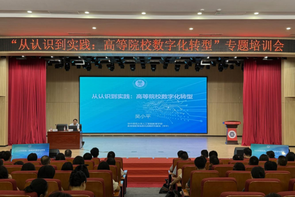(学校办公室 郭瑞)为进一步推进学校教育数字化转型,6月10日下午,学校在活动中心三楼报告厅举办专题培训会。华中师范大学人工智能教育学部常务副部长吴小平应邀为我们教师作专题辅导。校领导、全体中层干部、职能部门全体管理人员,各二级学院辅导员、实验员、教学秘书、教研室主任和专业负责人参会。培训会由校长助理贾娴雅主持。