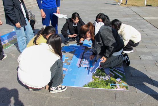 除了紧张刺激的定向越野比赛,活动中还设置了“片语寄情,礼赞理工”和“大美理工,由你来拼”两个趣味游戏环节,教职工通过转动转盘选择主题写下自己对学校、同事的感悟和祝福,粘贴至主题墙并合影留念;三人一组协作完成校园美景图片的拼图任务,现场气氛热烈,欢笑不断。