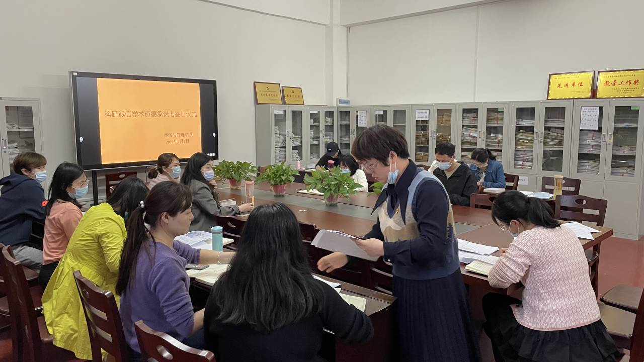 (经管系 方玉泉)为促进优良学术建设,规范学术行为,维护学术诚信。经济与管理学系于2022年4月7日下午在J4-309会议室召开了“科研诚信学术道德承诺书签署会议”。会议由系部科研秘书方玉泉老师主持,教学主任朱靖和全体教师参加了会议。