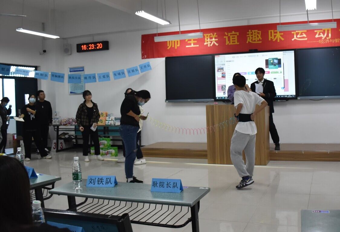 (经管系 赵娴)10月20日下午,经济与管理学系在J1-507开展了第一届师生联谊趣味运动会。此次趣味运动会由经管系教工工会与学生会联合打造,以“师生合力、其利断金”为主题,旨在通过师生联谊的方式,进一步加深师生情谊,在良好的师生关系中更好地促进今后的生活和学习。
