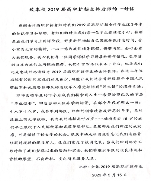 据悉,写下这封情意满满的感谢信的学生代表是经济与管理学系2019届高职扩招学生周选波,经管系教学副主任朱靖在收到来信后表达了对2019届高职扩招班毕业学生们的祝贺,希望大家前程似锦,退伍不褪色,在各行各业施展自己的才华,为国家、社会作出贡献。