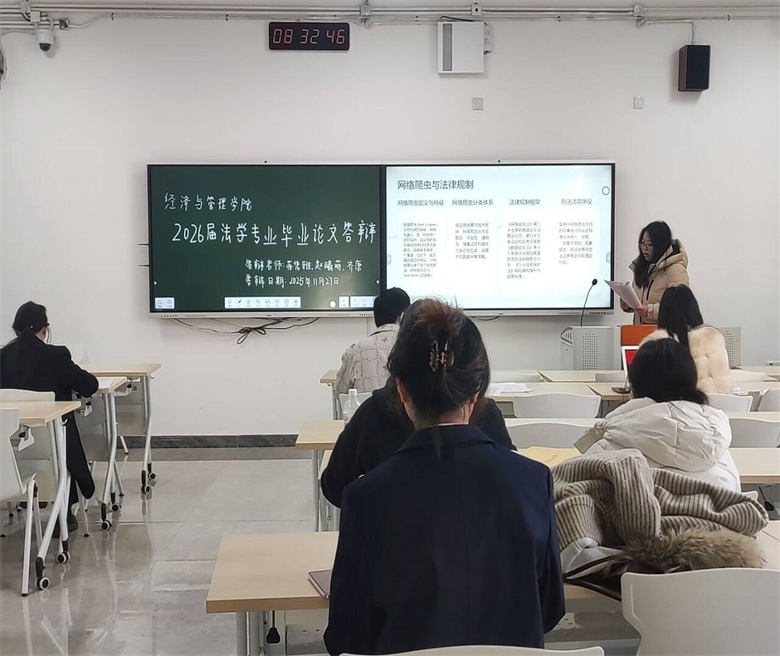 (经管学院 李艾沛)11月27至28日,经济与管理学院顺利举行了2026届本科毕业论文答辩。本次答辩涉及投资学、国际经济与贸易、法学三个专业方向,共125名同学参加,答辩通过率91.2%。同学们围绕各自的研究课题,结合专业理论与实际案例,进行了深入的分析与探讨,并提出了富有创新性和实践价值的观点。