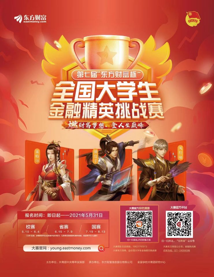 2021年5月10日,由共青团中央青年发展部主办,全国学校共青团研究中心承办的第七届“东财杯”全国大学生金融精英挑战赛校赛正式开幕。我们共有172名同学报名参加本届“东财杯”全国大学生金融精英挑战赛校赛。校赛时间从5月10日到6月4日,最终会有30%的同学进入决赛,代表我们参加6月15日到7月9日举行的省赛,国赛举行时间为7月19日到8月13日。