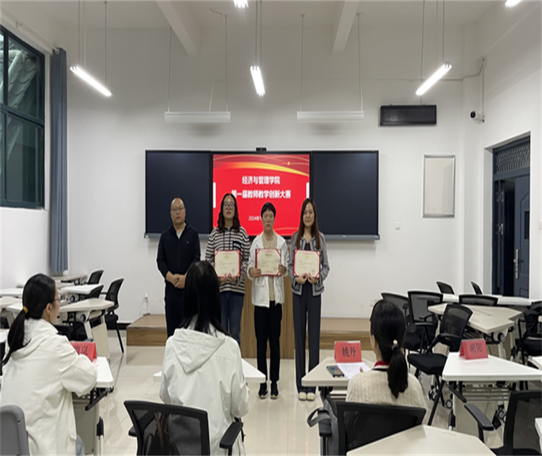 经济与管理学院院长胡阳为获奖教师颁发荣誉证书,并鼓励老师们能以赛促教、以赛促改、以赛促新,在教学上能突破自我,用于创新,为社会培养更加优秀的复合型人才。