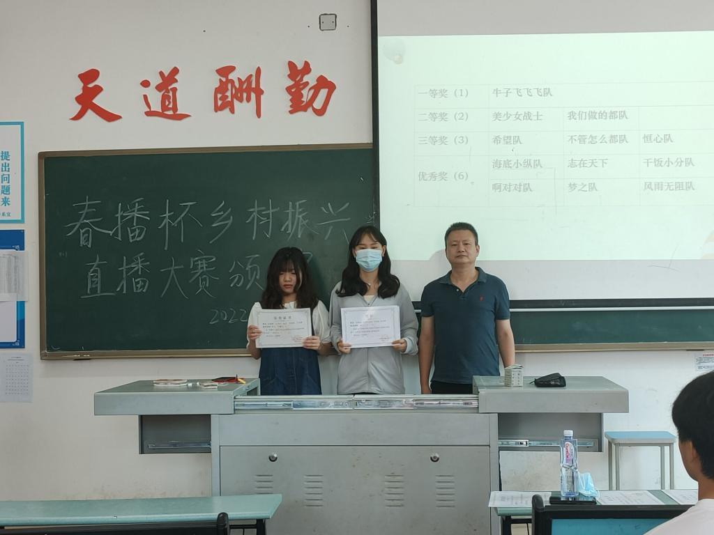 首先,姚丹老师介绍了此次“春播杯”乡村振兴直播助农赛的基本情况,宣布了获得一等奖、二等奖、三等奖和优秀奖的团队名称。接着,由汪院长、朱主任、左林、韩贝贝、徐凡和徐丹丹分别为此次获奖的同学颁奖。然后,获奖学生代表刘娉婷同学发表了获奖感言,指导老师代表姚丹老师发言。最后是学校领导汪院长发言,汪院长介绍了我们乡村振兴工作的基本情况,对此次参加直播大赛获奖的同学表示祝贺,希望同学们能积极投身乡村振兴工作中去,为乡村振兴贡献自己的青春力量。