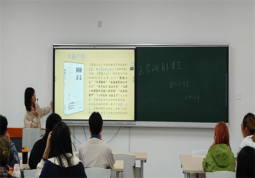 第一组同学分享了中国政法大学陈碧教授《正义的回响》,通过对书中热点问题“公平和正义”的介绍和分析,给人以新的思考。第二组和第四组同学分享了著名的《洞穴奇案》,通过对法理与情理、法学和哲学的探讨,给人以跨学科的体验。第三组同学分享了罗翔老师的《圆圈正义》,这本书探讨了法律、正义、道德的理念与现实,通过对该书的分享,可以让同学们更好的理解法律背后更深层次的价值基础。
