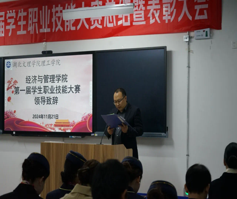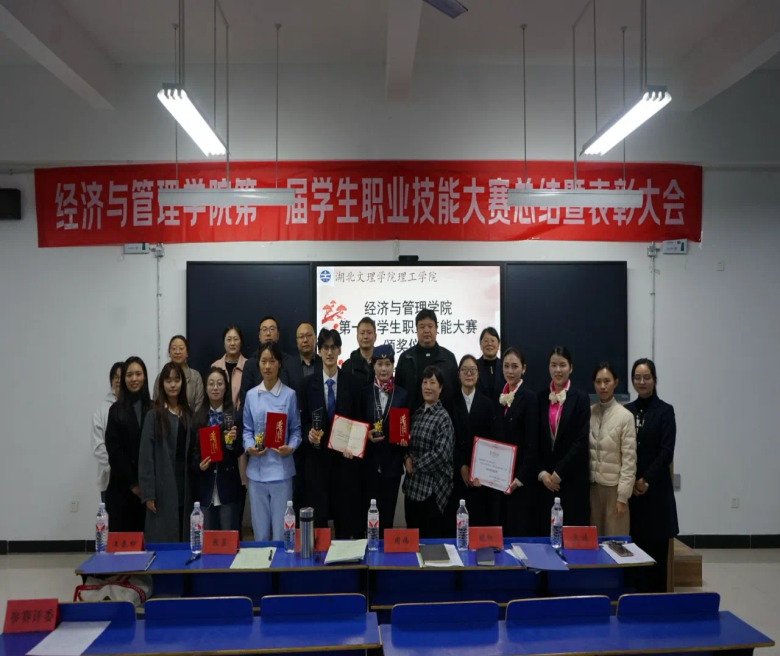 比赛结束后,经济与管理学院于1教207教室举行第一届学生职业技能大赛总结暨表彰大会。副校长汪波、副校长周伟、教学科研部副部长张翼、经济与管理学院全体教职工参会,校领导为获奖选手颁发奖杯和荣誉证书。