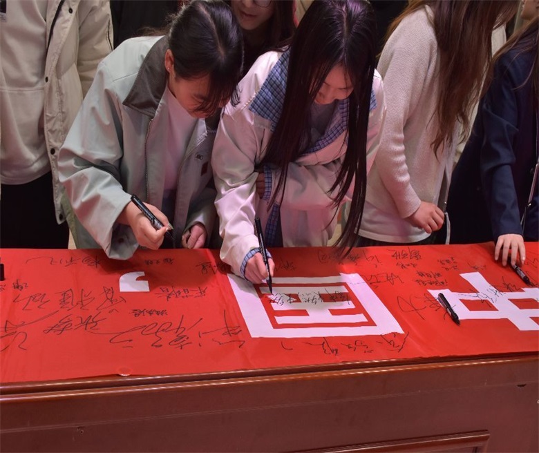 活动尾声,学生代表们纷纷上台在环保倡议横幅上签名,表达对环保事业的坚定支持,并与运建立女士合影留念。值得一提的是,当天恰逢运建立女士81岁生日,学校特别策划了一场温馨的生日会,为她送上鲜花和生日礼物。