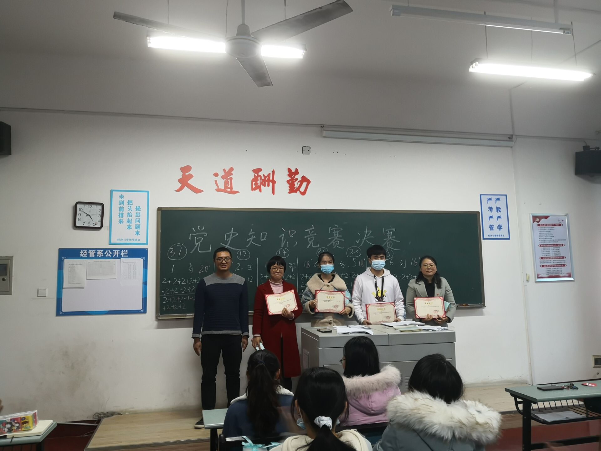 (经管系 徐丹丹)为了提高党性修养,增强经管系教师党员和学生党员学习政治理论知识的意识。11月10日下午和11月19日下午3点50,经管系党总支在4教315开展党史知识竞赛初赛和决赛,教工党支部全体党员和学生党支部在校党员参加。