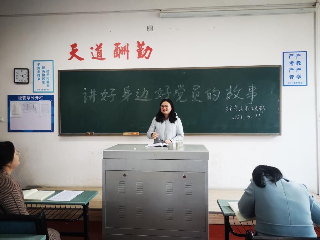 (通讯员 钟会荟)3月11日下午,经管系教工支部在J4-315开展了三月份主题党日活动,全体教师党员参加。本月的X活动是讲好身边好党员的故事。 老师们踊跃上台,分享着自己心目中的好党员的故事。老师们心目中的好党员都来自我们身边,有我们大家熟悉的领导和同事,有自己的家人,还有社区双报到的支部书记等。 现场气氛非常温馨,很多老师都认为王春柳书记、朱靖主任还有肖岚书记就是我们身边的好党员,王书记工作繁忙任劳任怨,关心关爱学生,膝盖磨损受伤仍然坚持工作,这种敬业的精神值得所有教师学习。还有我们的朱靖主任,很多老师都提到朱主任对待工作矜矜业业一丝不苟,是我们学习的榜样。另外,在工作中,朱主任总是设身处地的为老师们考虑,让老师们倍感温暖。肖岚书记作为经管系教工支部书记,同时还是投资学专业负责人,工作很繁忙但总能有条不紊的完成,带领教工支部开展了丰富多彩的支部活动。大家都表示在经管系这个有爱的大家庭工作感觉很幸福。新入职的王琨老师表示,这个集体跟她以前的工作单位太不一样了,身边的每一个领导和同事都让她觉得很温暖。 钟会荟老师分享的好党员是自己的父亲,讲述了其作为村支书的艰辛和不易,钟老师眼中,父亲与时俱进不断学习的精神、公私分明办事公道的作风都是她学习的榜样。 方玉泉老师分享了社区双报到的支部书记的故事,他们在繁忙的工作之余,能够花费那么多时间和精力参与社区党建,这种无私奉献、舍小家为大家的精神也是值得我们学习的。 最后,王春柳书记作了总结发言,认为这次X活动开展的非常有意义,希望全体教师都向身边的好党员学习,更好的践行党员的模范带头作用。