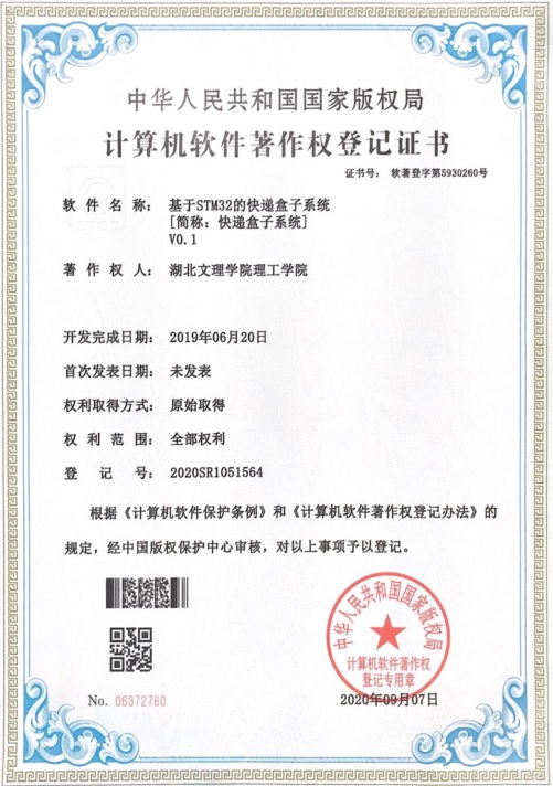 近日,我们电子科学与信息工程系黄巧巧老师自主开发的《基于STM32的快递盒子系统[简称:快递盒子系统]V0.1》喜获一项计算机软件著作权(登记号:2020SR1051564)。